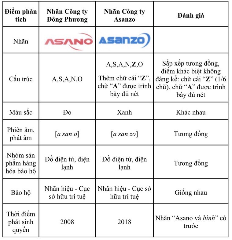 Qua việc phân tích sơ bộ các dấu hiệu trên, chúng ta nhận thấy: Tuy có sự khác biệt về màu sắc, các chữ cái là phụ âm được trình bày đủ nét nhưng kết hợp chữ và hình trên vẫn tạo thành tổng thể có khả năng gây nhầm lẫn với nhãn hiệu của Công ty Đông Phương. Do đó, có dấu hiệu cho thấy Công ty Asanzo xâm phạm quyền đối với nhãn hiệu theo quy định tại Điểm c Khoản 1 Điều 129 Luật SHTT.