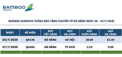 Bên cạnh 2 chuyến bay này, Bamboo Airways dự kiến tăng cường khai thác thêm 4 chuyến bay từ Đà Nẵng đi Hà Nội và TP HCM cũng trong ngày 26/7 tuỳ theo tình hình thực tế để phục vụ nhu cầu của hành khách. Hãng khuyến nghị hành khách liên tục theo dõi thông tin từ website và fanpage chính thức của Bamboo Airways để cập nhật thông tin mới nhất.