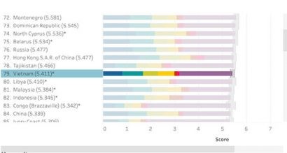 Trong Báo cáo Hạnh phúc Thế giới được công bố mới đây của Liên hợp quốc, thứ hạng của Việt Nam đã được cải thiện và tăng lên. Theo đó, Việt Nam đã vươn lên vị trí 79, trước đó, nước ta xếp hạng thứ 83. Được biết, thứ hạng của Việt Nam được đánh giá cao hơn so một số quốc gia Đông Nam Á khác như Malaysia, vị trí 81, Myanmar, vị trí 126.