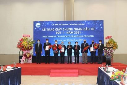 Sáng nay, ngày 21/5, UBND tỉnh Bình Dương đã tiến hành trao Giấy chứng nhận đăng ký đầu tư cho 5 doanh nghiệp có vốn đầu tư nước ngoài (FDI) với tổng vốn đầu tư gần 1 tỷ USD.