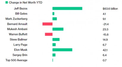 Trong số 10 người giàu nhất, chỉ có 2 người giảm tài sản là ông trùm hàng xa xỉ Bernard Arnault và Chủ tịch Berkshire Hathaway Warren Buffett. Và trong khi giới công nghệ giàu thêm, hơn 200 trong số 500 tỷ phú được Bloomberg theo dõi đã mất tiền trong năm nay.