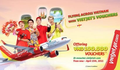 Từ nay đến 15/4/2021, khách hàng sẽ nhận ngay voucher 100.000 đồng khi đặt vé thành công và đăng ký thông tin tại địa chỉ: https://evoucher.vietjetair.com/, voucher được sử dụng cho lần đặt vé bay tiếp theo trước 30/6/2021.