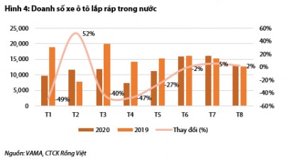 Theo VDSC, các chính sách kể trên sẽ giúp giảm chi phí sản xuất và dịch vụ, dẫn đến tổng chi phí mua xe giảm, cầu mua xe của người dân tăng. Thêm vào đó, tăng trưởng GDP quý 3/2020 đạt 2,62% đã cho thấy sự phục hồi của nền kinh tế cũng như thu nhập của người dân. Trên thực tế, trong tháng 7 và tháng 9, doanh số bán hàng xe ô tô lắp ráp nội địa đã ghi nhận sự tăng trưởng. VDSC dự báo trong quý 4/2020 và sang năm 2021, doanh số xe ô tô sẽ tiếp tục phục hồi.