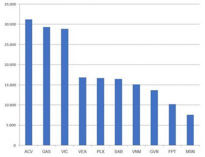 Đáng lưu ý, top 10 năm 2019 đã có sự thay đổi đáng kể về thứ tự. Theo đó, Tổng công ty cổ phần Cảng hàng không (ACV, mã: ACV) đã vươn lên vị trí dẫn đầu với 31.271 tỷ đồng, trong khi Tổng công ty Khí Việt Nam (PV GAS, mã: GAS) tụt hạng sau 4 năm chiếm ngôi đầu, nắm giữ 29.391 tỷ đồng.