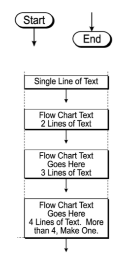 Nội dung viết cho mỗi lưu đồ sẽ khác nhau dựa trên chủ đề của từng ứng dụng; tuy nhiên, các hộp và mũi tên tạo nên lưu đồ phải tuân theo một chủ đề tổ chức nhất quán. Mẫu E minh họa hai ý tưởng cơ bản nhất để tạo ra một lưu đồ rõ ràng, được sắp xếp tốt và có tính thẩm mỹ. Ý tưởng được thể hiện là tất cả các hộp trong biểu đồ phải có cùng chiều rộng — chiều cao của hộp sẽ được quyết định bởi số dòng văn bản và chiều rộng phải thống nhất giữa mỗi hộp.