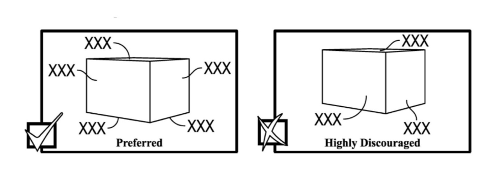 Tiếp theo là chữ XXX màu xanh lam ở giữa trang — chúng được gọi là số tham chiếu hoặc số được sử dụng để gọi một số tính năng nhất định trong mô tả bằng văn bản của bạn. Những con số này thường là chiều cao văn bản tối thiểu là 1/8 inch. Điều quan trọng cần lưu ý là USPTO sẽ giảm bớt các bản vẽ và để đảm bảo số tham chiếu của bạn dễ đọc, chúng cần phải có chiều cao thích hợp trong bản vẽ.