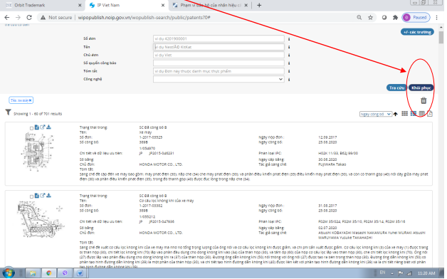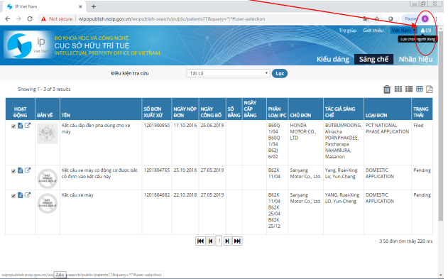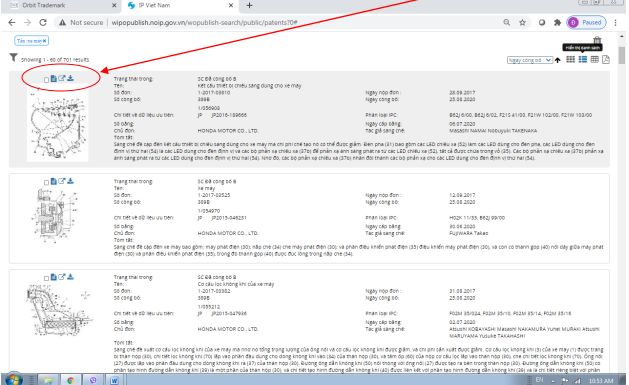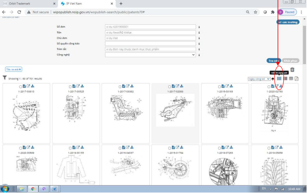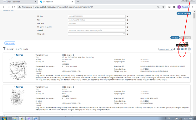 Khi cần vào để tìm thông tin chi tiết của một sáng chế cụ thể, click vào biểu tượng “hiển thị chi tiết” hoặc vào khu vực dòng chứa sáng chế đó: