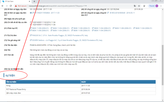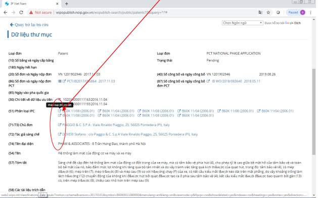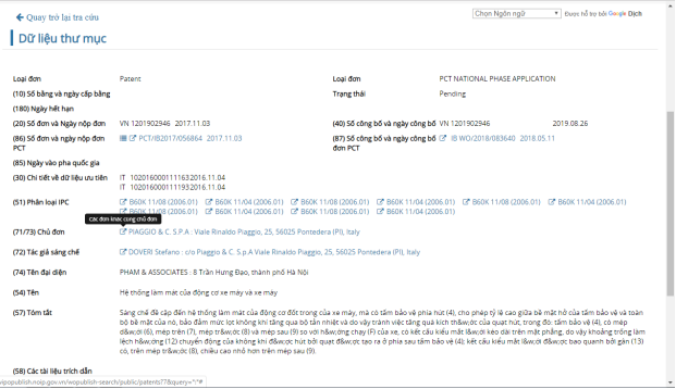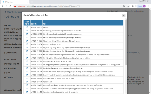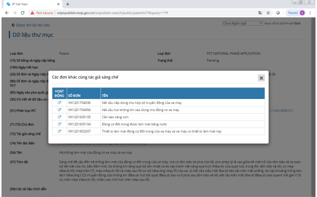 Ví dụ: tại mục Chủ đơn hoặc Tác giả sáng chế, khi người dùng click vào cửa sổ đó, công cụ tra cứu Wipo Publish sẽ hiển thị danh sách các đơn khác của chủ đơn hoặc tác giả.