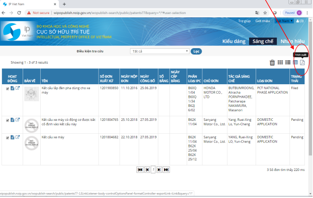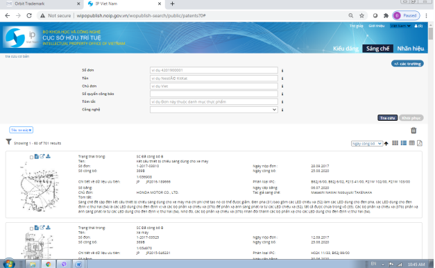 Người dùng có thể sắp xếp các kết quả tra cứu theo ngày nộp đơn, ngày cấp bằng, ngày công bố… tăng dần hoặc giảm dần, kết quả hiển thị dạng bảng: