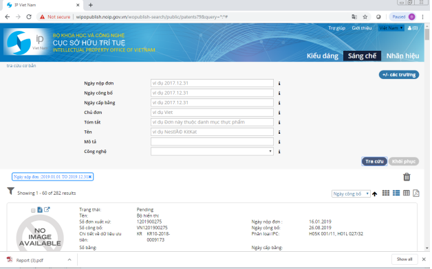 Khi muốn thống kê đơn/bằng trong một khoảng thời gian, ví dụ thống kê đơn đã được nộp từ 01/01/2019 đến 31/12/2019, click vào trường dữ liệu “ngày nộp đơn” và lựa chọn khoảng thời gian tương ứng, “2019.01.01 TO 2019.12.31”, sau đó click vào biểu tượng “tra cứu”: