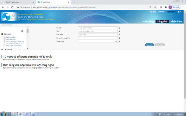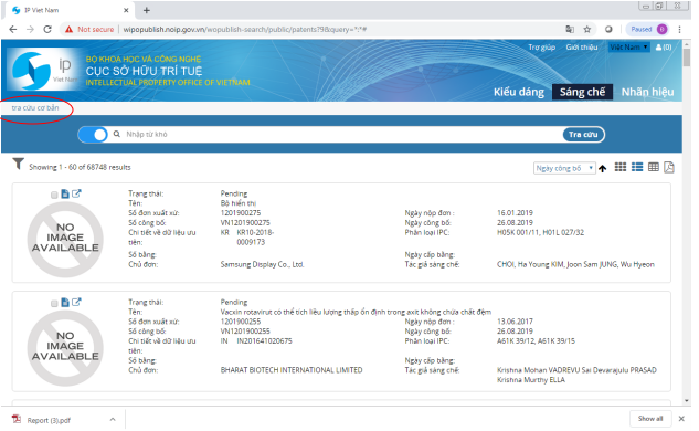 Màn hình mặc định khi truy cập vào chức năng tra cứu sáng chế: