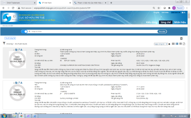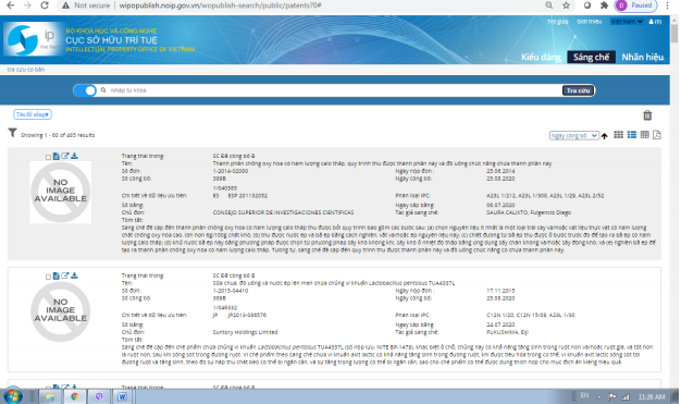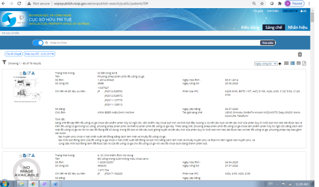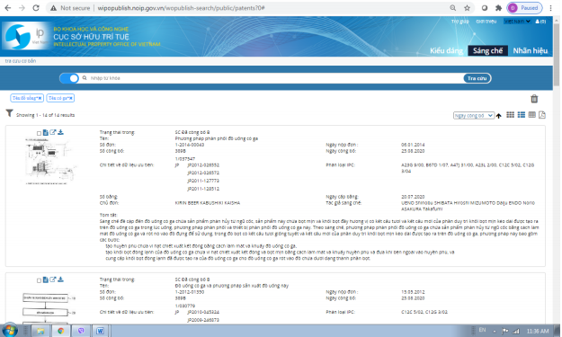 Khi đó kết quả trả về là 485 kết quả có từ khóa “đồ uống” xuất hiện trong tên sáng chế: