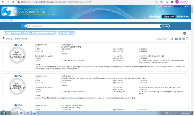Ví dụ muốn tra cứu các sáng chế có từ khóa “kem đánh răng” hoặc “thuốc đánh răng” và có phân loại IPC A61K: nhập từ khóa “kem đánh răng” chọn trường dữ liệu tra cứu là “toàn bộ các trường”, sau đó ấn phím “enter”, tiếp tục nhập từ khóa “thuốc đánh răng” chọn trường dữ liệu tra cứu là “toàn bộ các trường”, sau đó ấn phím “enter”, nhập A61K, chọn trường dữ liệu là “phân loại IPC”, sau đó click vào “tra cứu”, lúc này kết quả trả về có 110 kết quả có từ khóa “kem đánh răng” hoặc “thuốc đánh răng” và có phân loại IPC A61K.