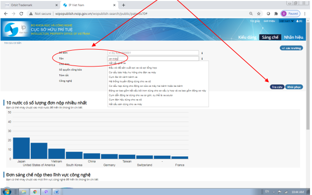 Khi muốn tra cứu theo tên sáng chế, ví dụ tra cứu các sáng chế có từ khóa “xe máy” xuất hiện trong tên sáng chế, người dùng nhập từ khóa “xe máy” vào trường dữ liệu “tên”, sau đó click chuột vào “tra cứu”: