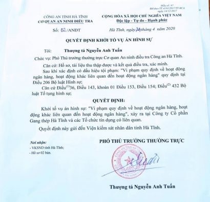 Ngày 24/4, thông tin từ Cơ quan an ninh điều tra Công an Hà Tĩnh, đơn vị vừa ra quyết định khởi tố vụ án “Vi phạm quy định về hoạt động ngân hàng, hoạt động khác liên quan đến hoạt động ngân hàng” theo Điều 206 Bộ luật Hình sự năm 2015, xảy ra tại công ty Cổ phần Gang thép Hà Tĩnh và các Tổ chức tín dụng có liên quan để tiến hành điều tra, xử lý theo quy định của pháp luật.