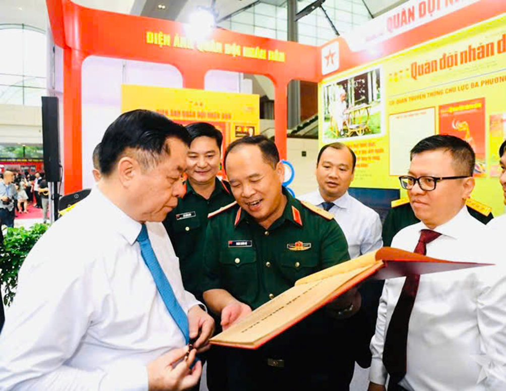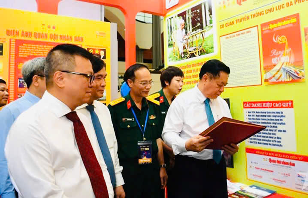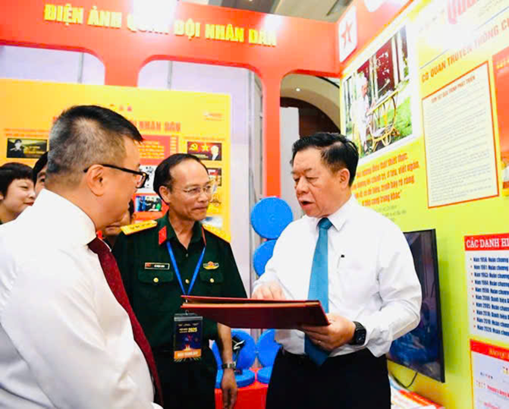 Đồng chí Nguyễn Trọng Nghĩa, Ủy viên Bộ Chính trị, Bí thư Trung ương Đảng, Trưởng ban Tuyên giáo và Dân vận Trung ương; đồng chí Lê Quốc Minh, Ủy viên Trung ương Đảng, Tổng biên tập Báo Nhân Dân, Phó trưởng ban Tuyên giáo và Dân vận Trung ương, Chủ tịch Hội Nhà báo Việt Nam, Trưởng ban Chỉ đạo Hội Báo toàn quốc 2025 cùng các đại biểu tham quan khu trưng bày.