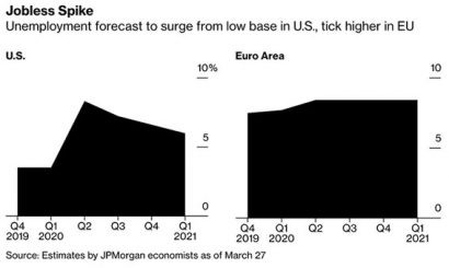 Tại JPMorgan, các nhà kinh tế dự đoán tỷ lệ thất nghiệp tại các nền kinh tế phát triển sẽ tăng 2,7 điểm phần trăm vào giữa năm nay, từ mức thấp trong 4 thập kỷ vào đầu năm nay. Dù con số trên sẽ được cải thiện phần nào khi các nền kinh tế hồi phục, nhưng JPMorgan vẫn ước tính tỷ lệ thất nghiệp ở Mỹ sẽ tăng 4,6%, khu vực đồng euro là 8,3% vào cuối năm 2021.