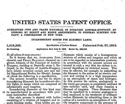 Bằng sáng chế của GE về đèn dây tóc vonfram (Nguồn: wikipedia.org)