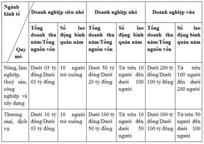 Ở Việt Nam, sự hình thành quan niệm và cách xác định DNNVV rất khác nhau qua các thời kỳ phát triển. Tuy nhiên, đến năm 2017, Quốc hội ban hành Luật Hỗ trợ DNNVV đã đưa ra tiêu chí xác định DNNVV bao gồm doanh nghiệp siêu nhỏ, doanh nghiệp nhỏ và doanh nghiệp vừa, có số lao động tham gia bảo hiểm xã hội bình quân năm không quá 200 người đáp ứng tổng nguồn vốn không quá 100 tỷ đồng hoặc tổng doanh thu của năm trước liền kề không quá 300 tỷ đồng. Ngày 11/3/2018, Chính phủ ban hành Nghị định số 39/2018/NĐ-CP quy định chi tiết một số điều của Luật Hỗ trợ DNNVV, Điều 6 Nghị định này quy định chi tiết tiêu chí xác định DNNVV, cụ thể như sau: (Bảng 1)