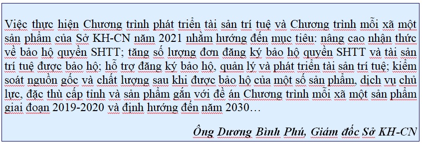 Trong kế hoạch thực hiện Chương trình phát triển tài sản trí tuệ và Chương trình mỗi xã một sản phẩm năm 2021, Sở KH-CN đưa ra các nhiệm vụ, giải pháp cụ thể giai đoạn 2021-2025, chiến lược SHTT đến năm 2030 và chương trình Mỗi xã một sản phẩm trên địa bàn tỉnh đảm bảo đúng tiến độ.