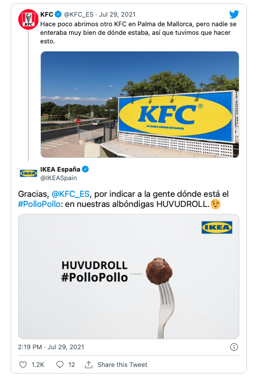 KFC đã sao chép nhãn hiệu với tông vàng và xanh nước biển đặc trưng của IKEA thay vì trắng đỏ thông thường, tạo thành các biển hiệu treo tại nhiểu tuyến đường với dòng chữ quảng cáo nhỏ “Ya sabes donde estamos” (Bạn biết cửa hàng của chúng tôi ở đâu rồi đấy). Một chiêu trò đạo nhái đầy chủ đích và tạo được hiệu quả marketing cao.