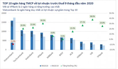 Những ngân hàng tiếp theo lọt top 10 lợi nhuận 9 tháng đầu năm 2020 gồm VietinBank, VPBank, MBBank, BIDV, ACB, HDBank, VIB, TPBank. So với cùng kỳ năm ngoái, TPBank đã thay thế Sacombank để lọt vào Top 10.