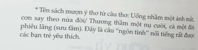Điều đáng chú ý hơn trong vụ việc trên, Công ty cổ phần sách Amun sử dụng hai câu thơ của nhà thơ Thục linh làm nhan đề nhưng tại trang 4 của sách lại chú thích với nội dung: “Tên sách mượn ý thơ từ câu thơ: Uống nhầm một ánh mắt, cơn say theo nửa đời/ Thương thầm một nụ cười, cả một đời phiêu lãng (sưu tầm). Đây là câu “ngôn tình” nổi tiếng rất được các bạn trẻ yêu thích”.