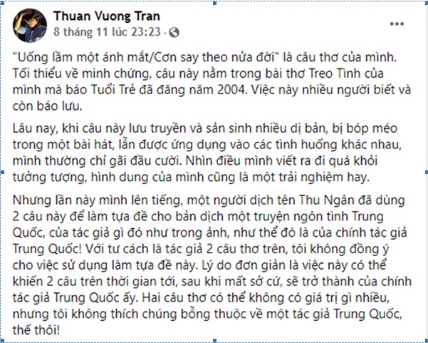 Không những thế còn không ghi rõ tên tác giả. Sau khi biết sự việc, nhà thơ Thục Linh đã khẳng định mình là tác giả của hai câu thơ trên và đã được đăng trên báo Tuổi trẻ năm 2004. Do vậy, nhà thơ hoàn toàn có đầy đủ Quyền tác giả với hai câu thơ trên.