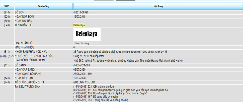Mầm mống nảy sinh tranh chấp khi ngày 12/03/2018, Công ty TNHH nhà bếp Intel (Công ty Intel) có trụ sở tạiNhà 35D, ngõ số 71, đường Hoàng Mai, phường Hoàng Văn Thụ, quận Hoàng Mai, thành phố Hà Nội nộp đơn tới Cục Sở hữu trí tuệ (NOIP) đề nghị đăng ký nhãn hiệu “Belenkaya” cho sản phẩm: Rượu gạo, đồ uống có cồn (trừ bia), rượu vỏ cam, rượu gin, rượu vodka, rượu uýt ki.