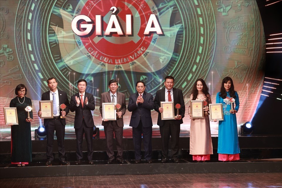 Thủ tướng Chính phủ Phạm Minh Chính và Thường trực Ban Bí thư Võ Văn Thưởng trao Giải A cho các tác giả và nhóm tác giả tại giải búa liềm vàng 2021